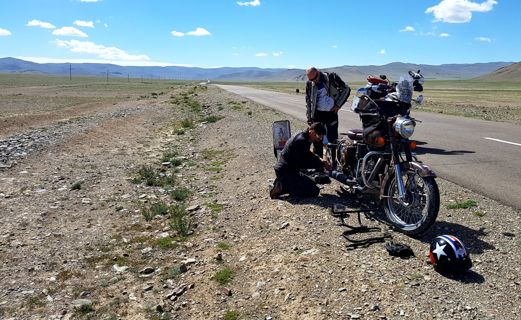 Asadar plecam impreuna cu Leo spre satul frontiera Ulaanbaishint. Drumul avea sa fie in mare parte asfalt, cu doar vreo 25 de kilometri de offroad. Pe drum Leo face o pana asa ca oprim pe marginea drumului sa o reparam. Bai frate, greu rau se desface Royal Einfieldul ala, pana dai roata spate jos desfaci 10 piese diferite… In fine, mai cu haz de necaz inlocuim camera si asamblam magareata la loc.