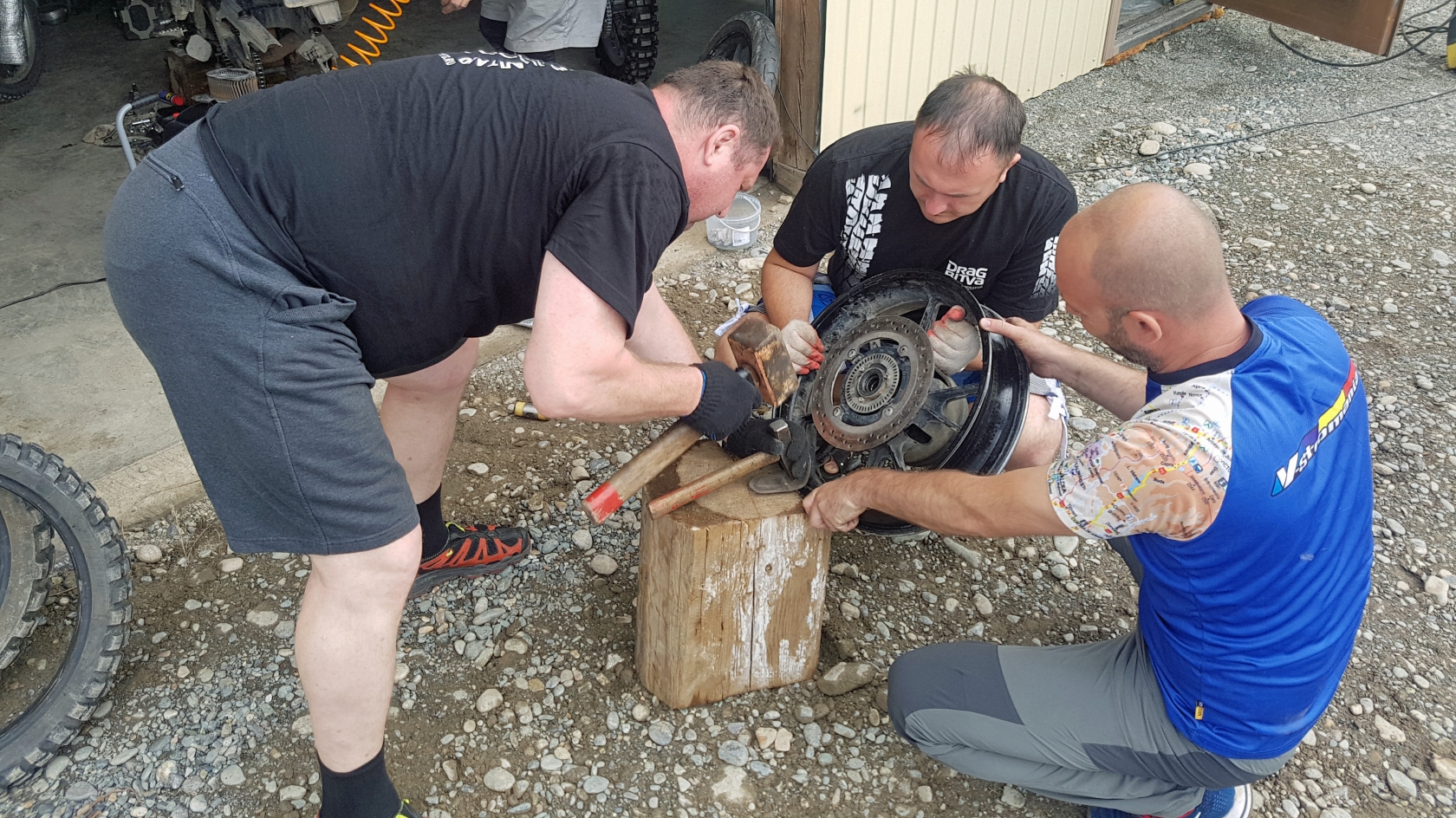 A doua zi aveam treaba. Adi trebuia sa schimbe cauciucurile Michelin Wild cu cele de strada, Metzeler Tourance. Din fericire chiar cand sa ne apucam Vladimir ne intreaba daca-s tubeless. Bine ca ne-a intrebat inainte sa le dam jos pentru ca nu avea compresor acolo. Chiar inainte sa plece cu vreo 5 “elevi” la un curs de motocross, da un telefon si comanda un compresor. Cam la 20 de minute dupa ce a plecat vine omul de la magazin cu compresorul tipla, nou-nout. Blana frate!
