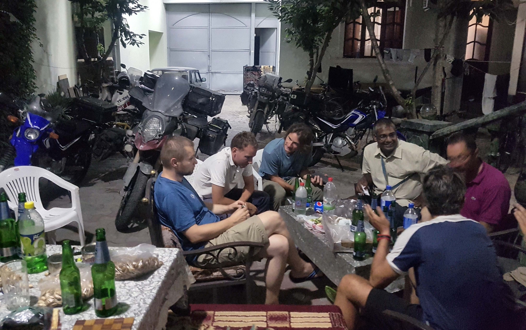 Seara ne gaseste pe amandoi, la o bere in curtea plina de motoare alaturi de alti calatori. Cum povesteam noi diverse, asa, intra pe poarta curtii un grup de baieti. Initial nu le-am dat atentie pana s-au apropiat de intrarea in vila. Cu voce tare, in romana ii spun lui Adi ceva de genul „Ia uita-l frate pe tipul ala, seamana leit ca un coleg de-al meu de liceu”. Am observat ca a ezitat nitel tipul insa si-a continuat drumul. In fine, nu dam atentie situatiei, baietii intra, noi ramanem la bere.