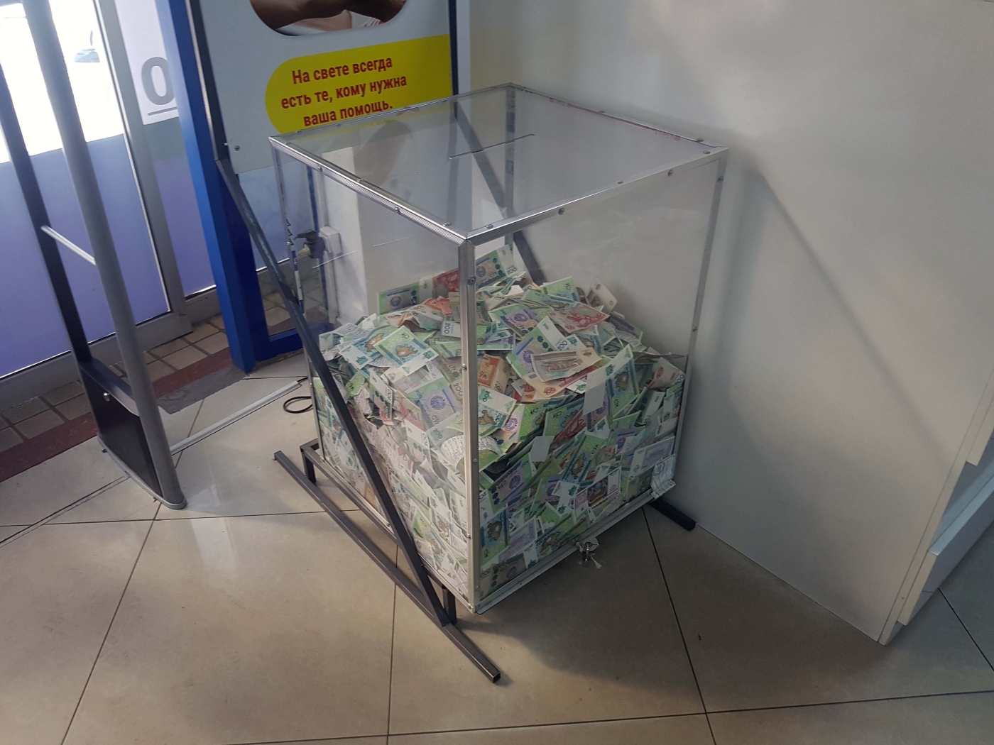 Dupa episodul cu ambasada ne-am intors la hostel via un supermarket. Asa arata o „cutiuta” pentru donatii: