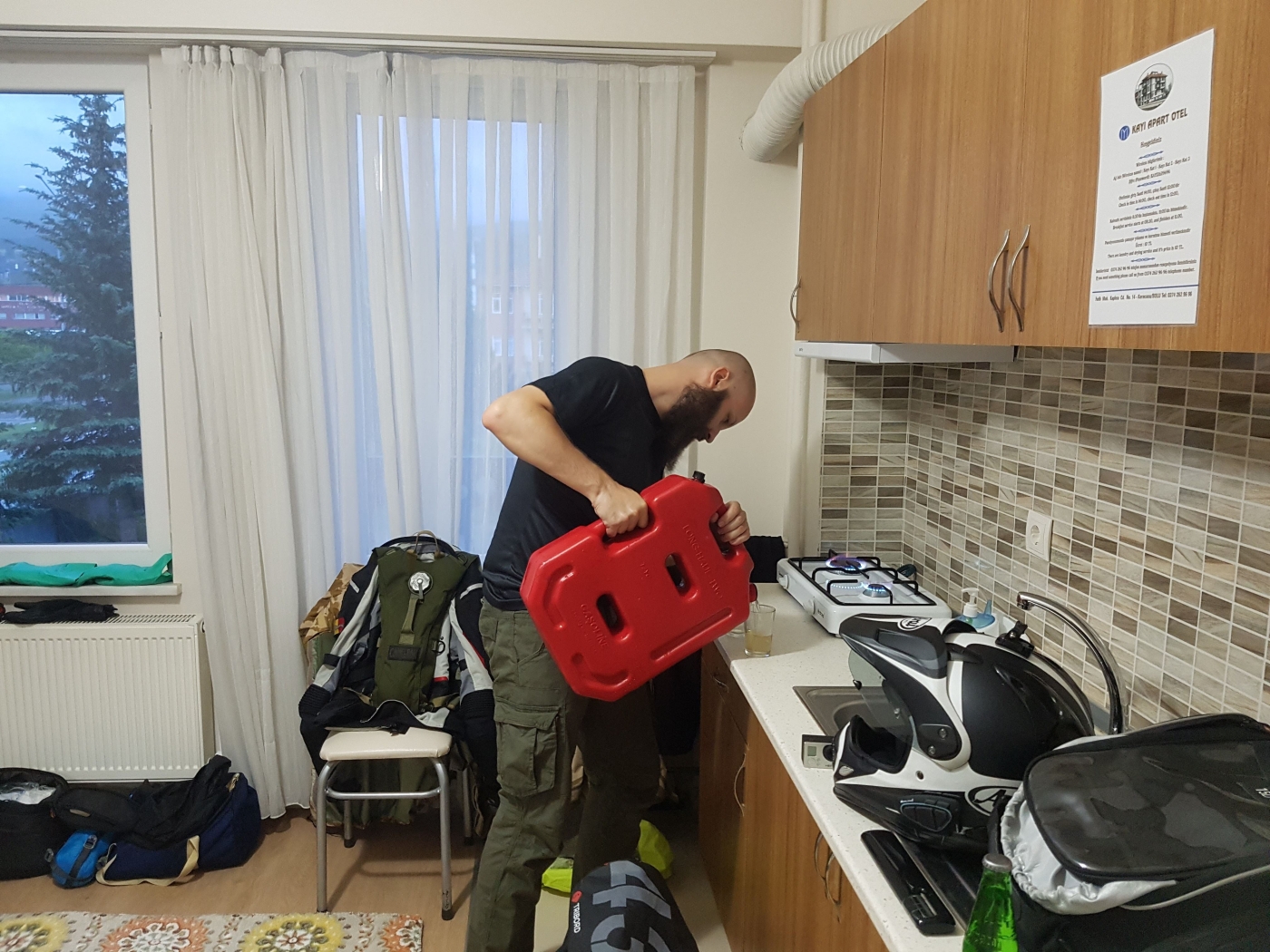 Am ajuns la Bolu uzi leoarca.. ne-a prins chiar inainte sa ajungem o ploaie „cu bulbuci” ce nu parea ca se va opri prea curand asa ca am mers inainte spre cazare. Cand am ajuns, am parcat motocicletele si tare-am fi dorit sa marcam finalul primei zile de concediu cu o bere cat mai rece. Surpriza insa.. in Turcia era Ramadan, asta inseamna ca nema alcool. A trebuit sa ne multumim cu niste apa minerala luata de la bar. Romanasii prevazatori insa nu raman „pe uscat” asa usor. Inainte sa plec am cumparat o canistra de benzina de plastic (10L) – pentru zilele negre de mers prin pustiu. Cum era noua canistra si preconizam sa aven nevoie de ea tocmai in indepartatul Uzbekistan am decis sa nu o iau goala… 5L de vin pana la urma nu strica.
