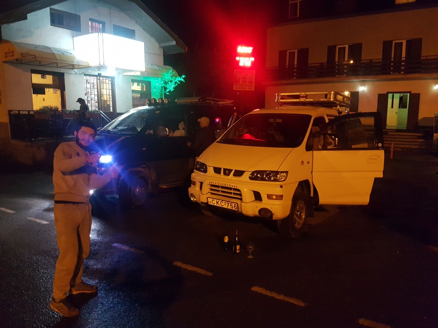 Dupa cateva ore oamenii incep sa plece, noi mai stam nitel sa aprofundam vinul georgian. Pana la urma se inchide restaurantul, zice-se defapt ca s-a inchis casa de marcat. „Protestam” si intr-un final ne invoim cu baietii ca plecam insa nu cu mana goala.. mai vrem o sticla de-asta magica. Accepta imediat, casa de marcat se repara magic, marcheaza sticla, la revedere, drum bun!